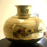 Water pot with tall narrow neck and rounded shape with horizontal lines and rounded base.