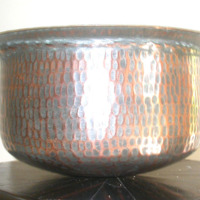 Wide mouth cylindrical pot with rounded base, with hammered rim and side and partially smooth base.