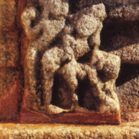 Description: Amorous couples, showing the female sitting on the lap of the male, figure among the auspicious symbols coming out of the jaws of the dragon or makara in ornamental arches associated with Buddhist temples of the late Anuradhapura period. On the lintel of a stone doorway at the Isurumuniya temple is this couple, one of a pair on either side of the arch, disgorged by the dragon.