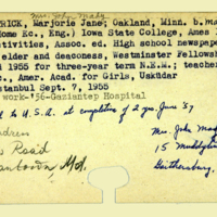 Description: Personnel card for Marjorie J. Kirkpatrick an employee of the American Board