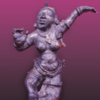 Description: This bronze figure of a female dancer was found at the Kuttampokuna or Twin ponds of the Abhayagiri monastery at Anuradhapura, Sri Lanka. Some authorities believe that it was a part of a chain suspending an oil lamp. It is important to note that female dancers were considered appropriate as decorative devices in buildings associated with monasteries during the mid-Anuradhapura period to which this bronze may be assigned.