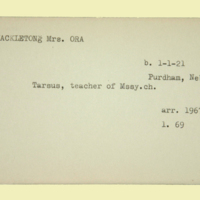 Description: Personnel card for Ora Shackleton an employee of the American Board