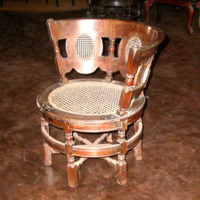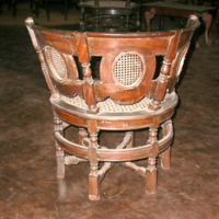 Description: Round chair with six legs, back is set with three ovals and circular seat in cane, turned legs and uprights supported by three intersecting stretchers