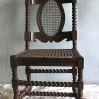 Description: Side chair, flat contoured crest rail with oval framed cane back, turned spiral side rails, cane seat, with turned spiral twisted legs and stretcher supports