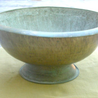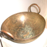 Description: Basin with rounded handles joint by rivets, with smooth interior and hammered exterior design.