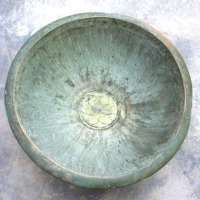 Description: Shallow footed bowl for washing raw rice, with thick inward turned lip, and deep grooved interior, designed to retain stones while washing.