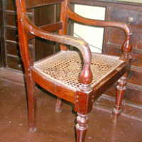 Description: Ceylon pattern armchair with overscrolled uprights, tablet-shaped top rail and curved cross bar, down turned armrests with baluster terminals, cane seat and turned tapering front legs. RJ