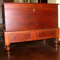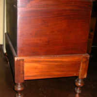 Description: Large chest, with hinged and lidded top, mounted on base with two drawers, supported by turned legs.