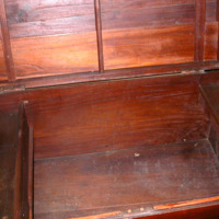 Description: Large chest, with hinged and lidded top, mounted on base with two drawers, supported by turned legs, viewed open.