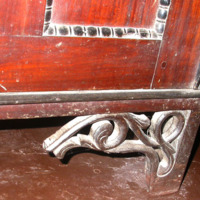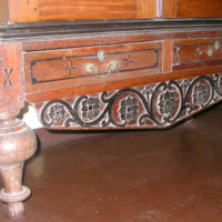 Description: Cupboard in two parts, consisting of an upper part with two doors, mounted on a lower part with two drawers and two doors, with ebony inlay and carved scroll design.