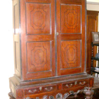 Description: Cupboard, the upper part with two ebony inlaid doors, the lower section with applied ebony floral design, two drawers and carved apron, raised on massive baluster turned legs. RJ