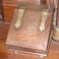 Description: Coal bin with a lid and brass hinges supported by small bun legs