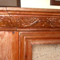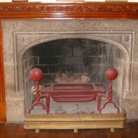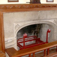 Description: Fireplace mantel of carved wood over a pitted stone face with floral design carved onto each corner