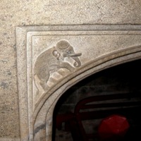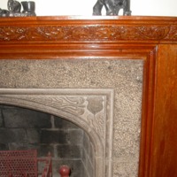 Description: Fireplace mantel of carved wood over a pitted stone face with floral design carved onto each corner, identical to ad.23