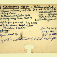 Description: Personnel card for Lloyd B. Swift an employee of the American Board