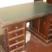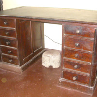 Description: Kneehole desk, the (later) faux leather top above two banks of drawers flanking the keehole recess, with locking strip, on plinth base. RJ