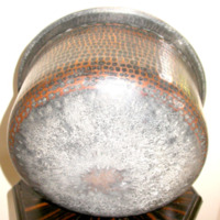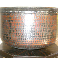 Description: Wide mouth cylindrical pot with rounded base, with hammered rim and side and smooth base.