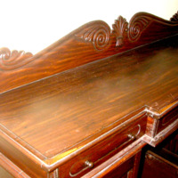 Description: Pedestal sideboard, with shaped and carved splash board, centred with carved shell motif, above three frieze drawers, with pedestal supports containing cupboards, on bun feet. RJ