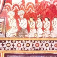 Description: An episode in the life of the Buddha picked out as worthy of illustration by painters of the Kandyan period (18th to early 19th century A.D.) is the offering of alms by Sujatha. She would have been considered typical of the average female lay devotee. This painting is from the Gangarama Vihare near Kandy, Sri Lanka.