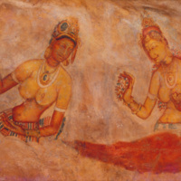 Description: Interpreted mostly as divine females and at times as royal queens, the women painted on the rock caves at Sigiriya, Sri Lanka, seem to be cast in the role of religious devotees. The figures are cut off at a point a little below the waist and they carry flower offerings.