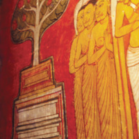 Description: The only illustration in art of Bhikkhunis or Buddhist nuns during the period covered by this survey is seen at Dambulla. This painting shows the arrival of bhikkhuni Sanghamitta (the founder of the order of Buddhist nuns in Si Lanka) together with her companions, bringing with them a sapling of the Bodhi tree, the tree under which the Buddha attained enlightenment.