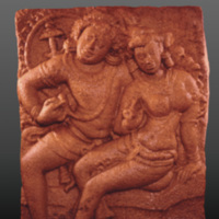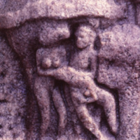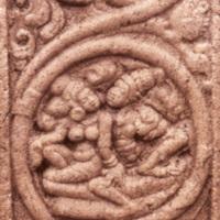 Description: Amorous couples, showing the female sitting on the lap of the male, figure among the auspicious symbols coming out of the jaws of the dragon or makara in ornamental arches associated with Buddhist temples of the late Anuradhapura period. On the lintel of a stone doorway at the Isurumuniya temple is this couple, one of a pair on either side of the arch, disgorged by the dragon.