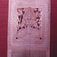 Description: On the subject of love, is this ivory comb from the Colombo National Museum. The carving seems to be of a female cupid, rather unusual in art, with a sugar-cane bow.