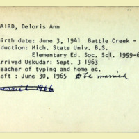 Description: Personnel card for Deloris A. Baird, an employee of the American Board