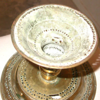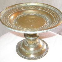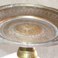 Shallow tray mounted on weighted pedestal, with pierced decorative bands, used for serving betel leaves,