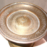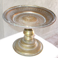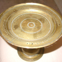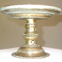 Shallow tray mounted on weighted pedestal, used for serving betel leaves, with pierced decorative bands.