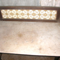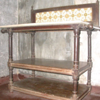 Description: Wash stand, with marble top and tiled splashboard, towel rails, two lower shelves, supported by turned uprights and legs. RJ
