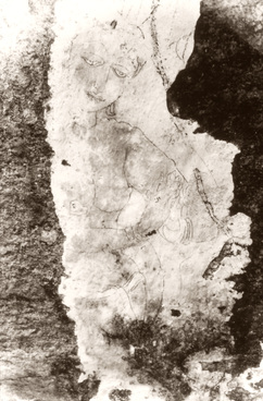 This slide is made from a photograph available at the Department of Archaeology in Colombo. Seen at Gonagala, Ampara, Sri Lanka. It is a section of a cave painting where a female devotee stands in a dance posture. She is worshiping a male figure, no doubt a deity. The painting has been attributed to the 8th century A. D. by scholars.