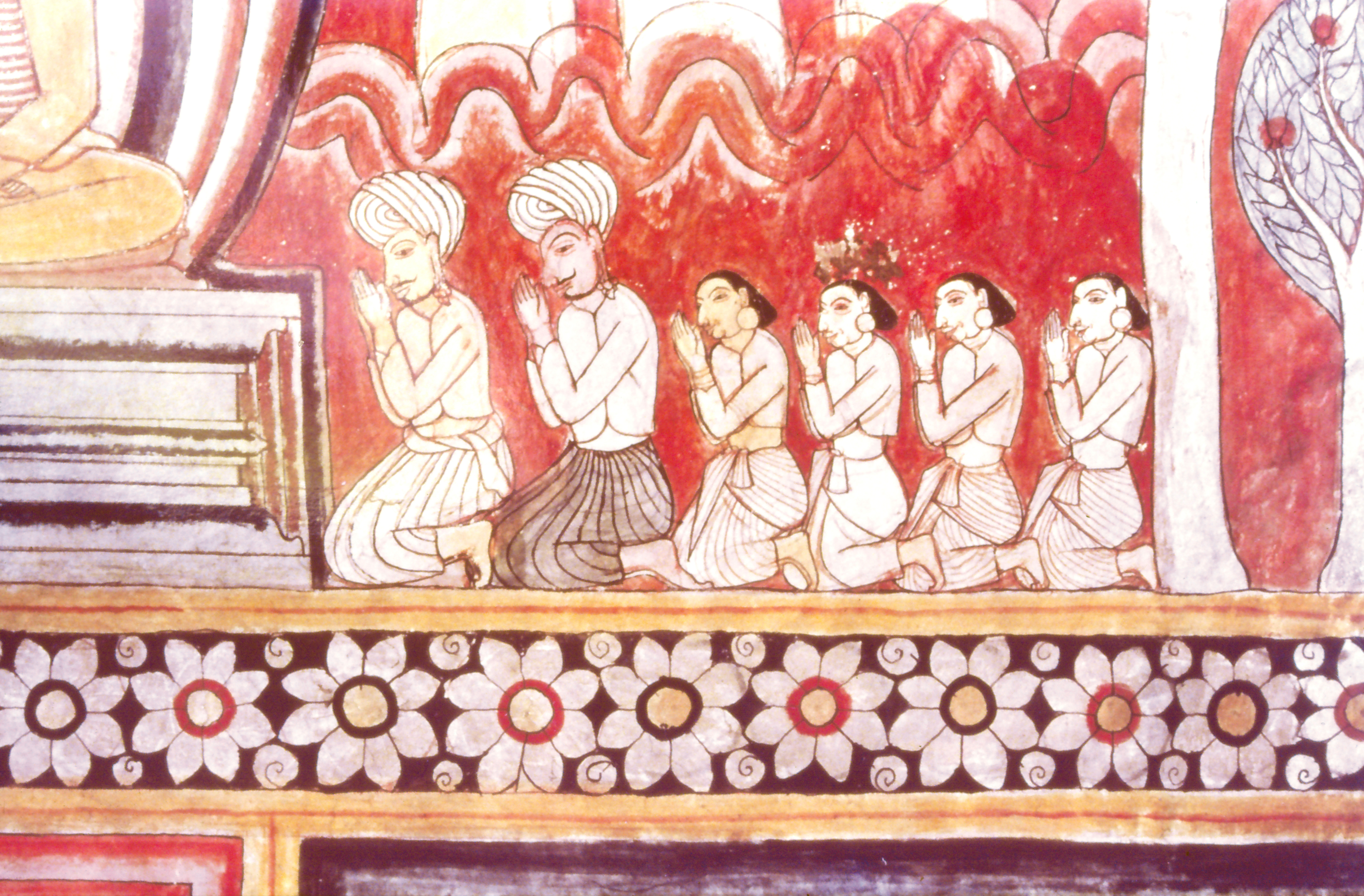 Among the cave paintings of Dambulla, which have been dated to the 18th century by art historians, is this illustration of four female devotees, seated behind two men, worshipping the Buddha.