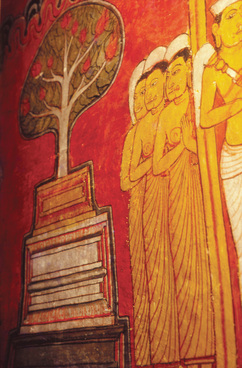 The only illustration in art of Bhikkhunis or Buddhist nuns during the period covered by this survey is seen at Dambulla. This painting shows the arrival of bhikkhuni Sanghamitta (the founder of the order of Buddhist nuns in Si Lanka) together with her companions, bringing with them a sapling of the Bodhi tree, the tree under which the Buddha attained enlightenment.