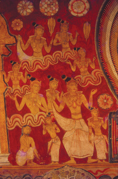 The temptations with which the Bodhisattva grappled are personified as the daughters of Mara, the evil one. In common with practically all the Kandyan temple paintings, the female as temptress, at the Dambulla Rock Temple, Sri Lanka, as shown here, is in dance pose. However, none of the daughters of Mara shown in the paintings of the Kandyan period can be described as sensuous creatures. For the 18th century Kandyan painter, the female as seductress perhaps lacked conviction.