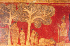 This painter at Degaldoruva, illustrating another episode in the Vessantara Jataka (one of the former birth stories of the Buddha), shows Madri-devi worshipping at the feet of her husband when she sees him in the garb of an ascetic.