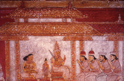 Painted on the walls of the Degaldoruva temple is this scene from the Vessantara Jataka (one of the former birth stories of the Buddha). Seated next to each other, while Vessantara talks to state officials, the queen suckles her infant daughter, sharply defining her domestic role, away from matters of state.