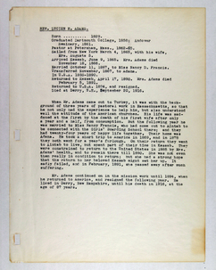 Amerikan Bord Heyeti (American Board), Istanbul, "Memorial records for Lucien H. Adams," American Research Institute in Turkey, Istanbul Center Library, online in Digital Library for International Research Archive, Item #16645, http://www.dlir.org/archive/items/show/16645 (accessed April 30, 2026).