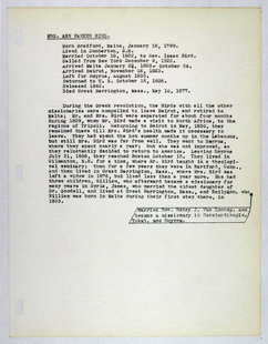 Amerikan Bord Heyeti (American Board), Istanbul, "Memorial records for Ann P. Bird ," American Research Institute in Turkey, Istanbul Center Library, online in Digital Library for International Research Archive, Item #16715, http://www.dlir.org/archive/items/show/16715 (accessed April 30, 2026).