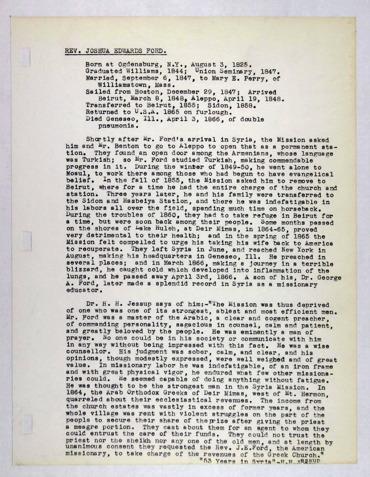 Amerikan Bord Heyeti (American Board), Istanbul, "Memorial records for Joshua E. Ford," American Research Institute in Turkey, Istanbul Center Library, online in Digital Library for International Research Archive, Item #16885, http://www.dlir.org/archive/items/show/16885 (accessed April 30, 2026).