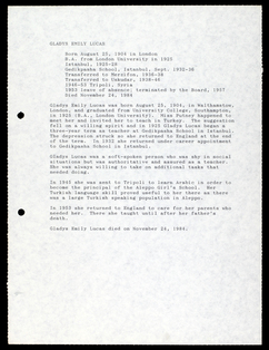 Amerikan Bord Heyeti (American Board), Istanbul, "Memorial records for Gladys Emily Lucas," American Research Institute in Turkey, Istanbul Center Library, online in Digital Library for International Research Archive, Item #17221, http://www.dlir.org/archive/items/show/17221 (accessed April 30, 2026).