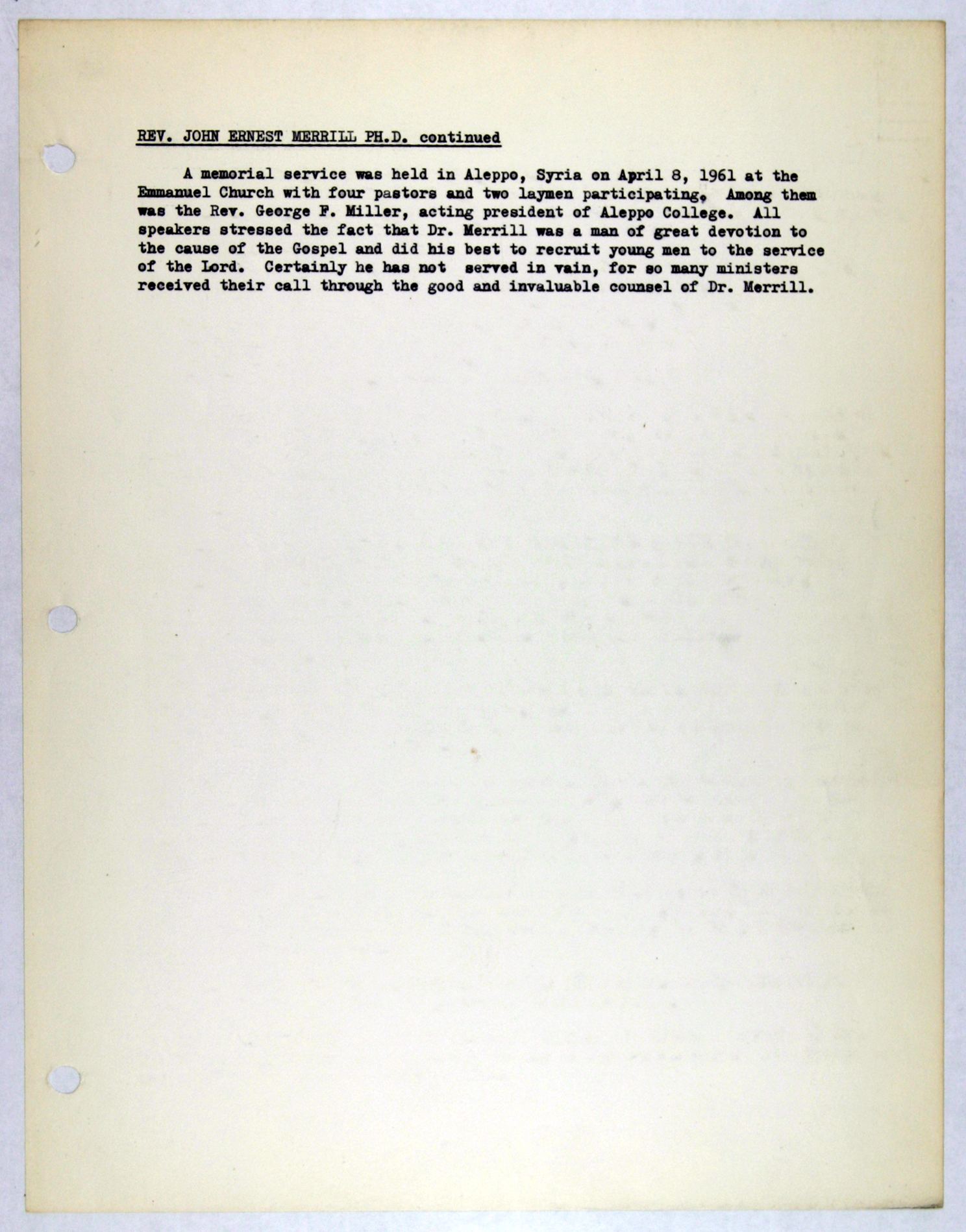 Memorial record for John E. Merrill, an employee of the American Board
