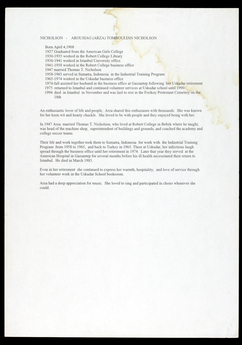Memorial record for Arousiag (Arza) Tomboulian Nicholson, an employee of the American Board