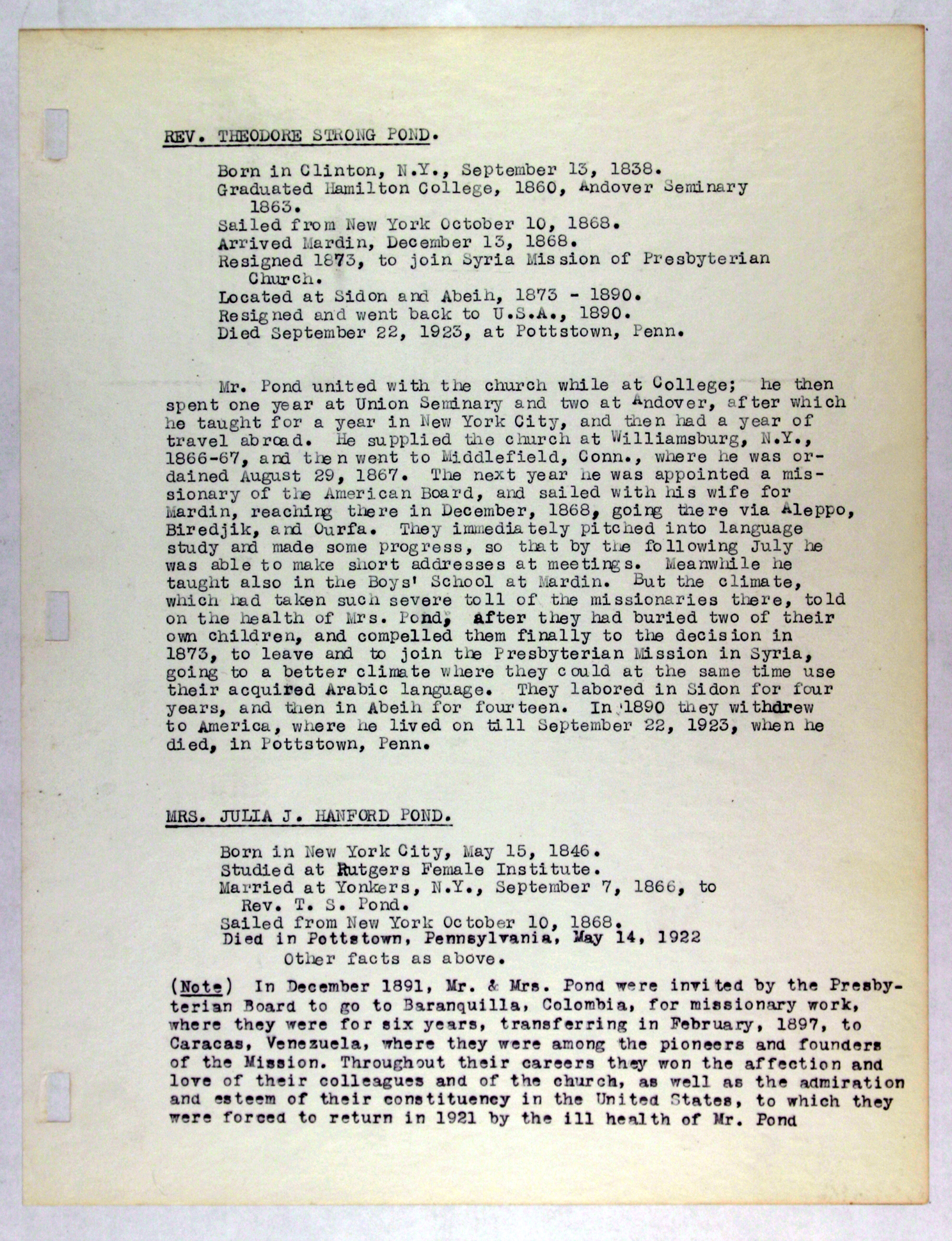 Memorial record for Theodore S. Pond, an employee of the American Board