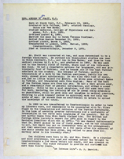 Amerikan Bord Heyeti (American Board), Istanbul, "Memorial records for Andrew T. Pratt," American Research Institute in Turkey, Istanbul Center Library, online in Digital Library for International Research Archive, Item #17379, http://www.dlir.org/archive/items/show/17379 (accessed April 30, 2026).