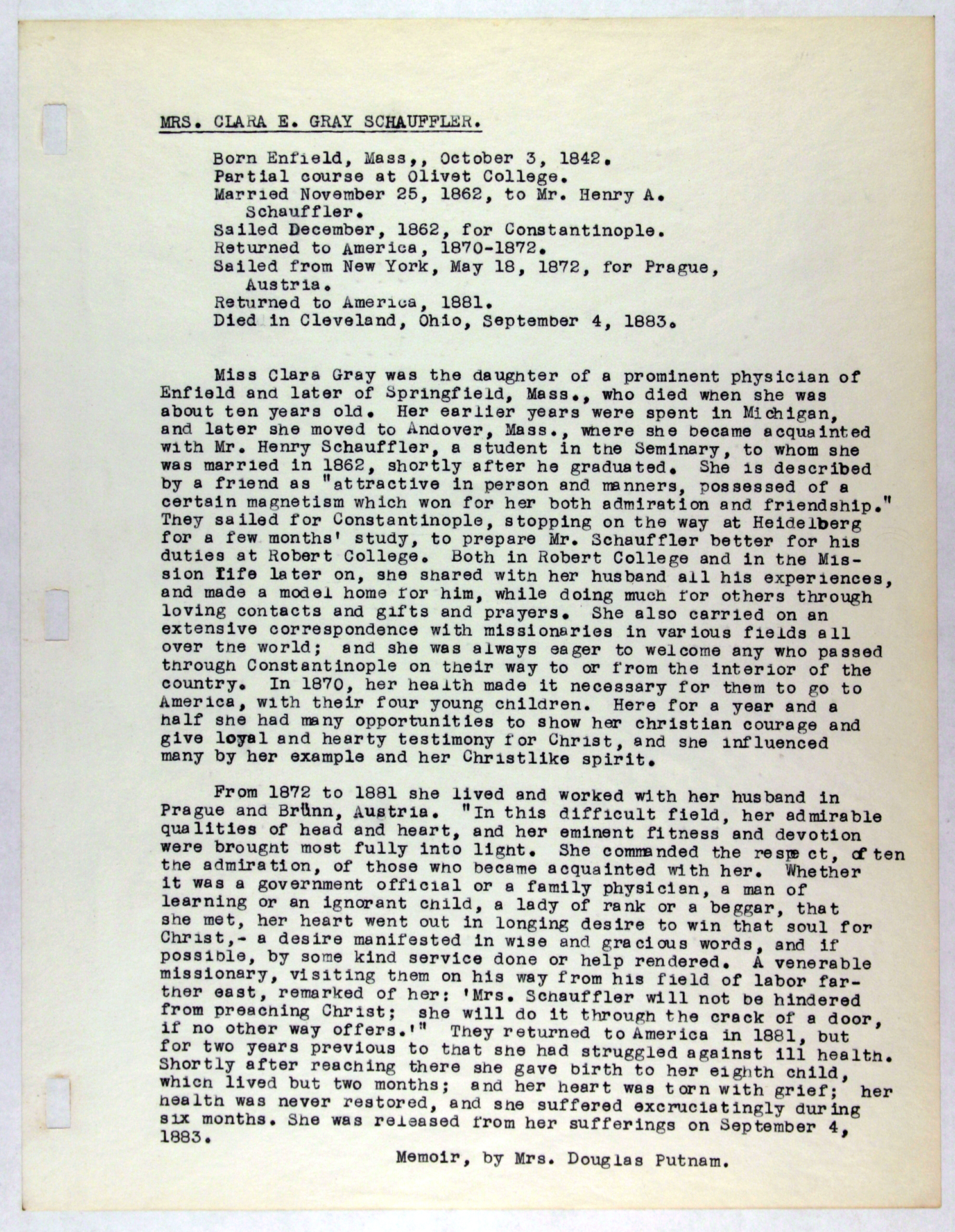 Amerikan Bord Heyeti (American Board), Istanbul, "Memorial records for Clara E.G. Schauffler," American Research Institute in Turkey, Istanbul Center Library, online in Digital Library for International Research Archive, Item #17429, http://www.dlir.org/archive/items/show/17429 (accessed April 30, 2026).