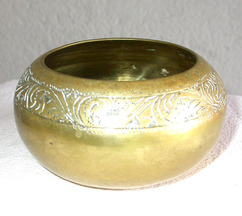 Low bowl, cast and turned with engraved scroll border, and rounded base.