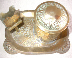Tray with cigarette container and matchbox holder, stamped engraved design with elphants and srolls.