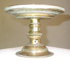 Shallow tray mounted on weighted pedestal, with pierced decorative bands, used for serving betel leaves,