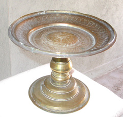 Shallow tray mounted on weighted pedestal, with pierced decorative bands, used for serving betel leaves,